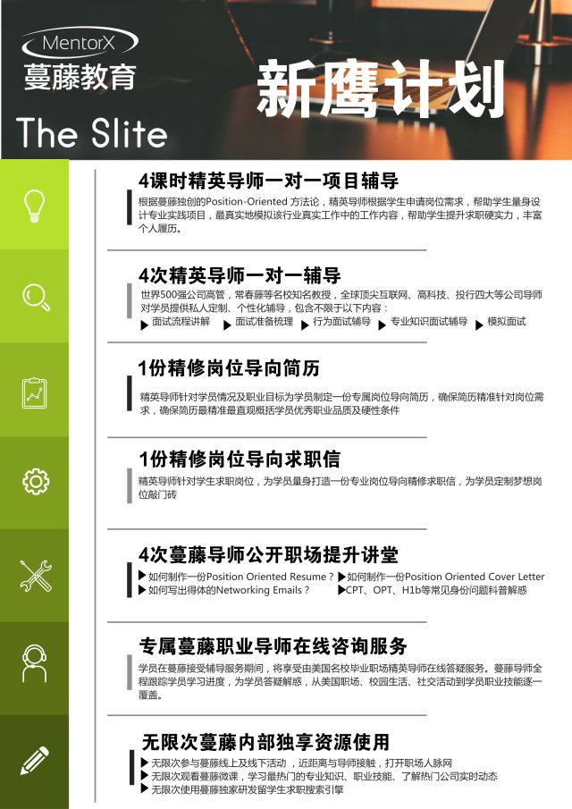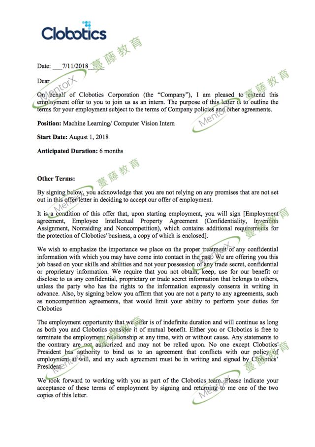 成功学员截图 学员档案 学校:UCLA 加州大学洛杉矶分校 专业:Electrical Engineering电子工程 GPA:3.89 学员进入项目时间:10/30/2018 Offer:Clobotics暑期实习 学员求职经验分享 学生参与项目主要是想为自己上一份双保险,在申请博士的同时,确保自己能够有另一条出路。学生在校内学习的是电子工程,学习能力和专业能力都非常强,对于数据挖掘、自然语言处理、人工智能、机器学习等内容掌握的很好,熟悉的编程语言也很多,Python、C++、Java、R、PHP、MySQL等都能够熟练运用。 为了帮助学生找到匹配其经历和水平的实习,蔓藤为他匹配了来自全美Top 3咨询公司的Yuhao导师,以及目前正在MIT计算机科学与人工智能学院的Ziyu老师帮助他进行专项辅导。一方面,导师们帮助学生提高了面试的各项软技能,从应答方式、专业交流等方面进行了提升。 另一方面,目前学生自己已经有非常强的学术背景,曾发表过四份论文,从专业技能上,导师为其进行了专项训练,带领他完成了两次非常好的Project,丰富了学生的经历,也帮助他进一步积累实际经验。 通过这样的辅导,学生成功通过Clobotics的面试,于七月份获得Offer。 导师介绍 -Yuhao 导师- 高级数据工程师,美国Top3计算机专业硕士。拥有多年一线数据工程工作经验。精通数据结构和算法,熟悉Python在高科技界和金融业的运用,擅长构建基于Python的数据挖掘/机器学习/Spark大数据平台。有丰富的面试经验,曾拿到多家硅谷top-tier科技公司offer,总结出自己一套技术面试方法,使学生精准抓住面试考查要点,在较短时间内提高面试命中率,辅导学生多人拿到一流公司offer -Ziyu 导师- MIT计算机科学与人工智能实验室研究员,长期研究数据驱动、机器学习、深度学习应用程序等领域,专注于临床实验室测试所使用的预测建模及临床决策支持系统,对于美国大数据、商业分析等行业有极强的敏锐度。同时也有丰富的实际经验,能够为学生提供业内最新消息,并带领学生了解如何掌握当前大数据发展趋势。 关于公司 扩博智能成立于2016年11月,总部位于中国上海,在北京和大连设有分支机构,在新加坡设有分公司,美国西雅图设有研发中心。 扩博智能聚焦计算机视觉和机器学习技术,专注于为行业企业用户提供端到端一体化智能服务,能大力提升传统行业运营效率,加快数字化变革,所服务的行业包括并不仅限于零售,风电和运营商等。 学员项目介绍 学员进入蔓藤的项目:新鹰计划 四对一全方位职业方向定位及解析 ✨ 解析学生兴趣行业的中美发展前景 ✨ 诊断学生当前的综合能力与优劣势 ✨ 匹配学生兴趣点与职业发展路径 三对一个性化制定求职路径方案 ✨ 量化分析学生当前能力与岗位需求差距 ✨ 全方位定制短期与长期职业培养目标 ✨ 个性化打造整体求职方向与职业路径 百节课时教育提升 ✨ 12节行业顶尖导师1对1辅导 ✨ 52周职业教育顾问咨询管理与专属答疑 ✨ 365天不间断职场招聘信息实时速递 ✨ 4000+中美合作企业内推职场资源 课程中全方位定期跟踪及反馈 ✨ 周/月/季度/年度定期跟踪校准学生进度 ✨ 阶段性为学员调整升级职业规划 ✨ 定期求职能力考评帮助学员突破 学员求职背景与技能加速提升 ✨ 中美名企实地实习机会 ✨ 精品美国职场项目实战 ✨ “保岗型”一对一求职冲刺训练 职场致胜,领跑人生 ✨ 职场精英人才蜕变和行业高端人脉搭建 ✨ 职场硬实力与软技能突破行业标准 ✨ 独享中美数万家名企岗位与导师资源库 想获取你的Offer? 小蔓 开启你的私人职业规划服务 在蔓藤,我们为您 特征分析 设定目标 规划路径 教育管理 发展评估 职场致胜 从前期职场规划,到最终实现北美就业。 蔓藤,是你身边的美国职场导师