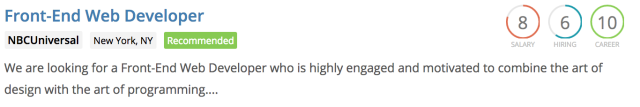 职场引擎 今日推荐 公司 美国NBC环球集团 地区 New York 职位 前端网站开发者(Front End Web Developer) 涉及领域 CS, web design ^ 综合评分:Salary: 8/ Hiring: 6 / Career: 10 一、公司科普: NBCUniversal NBC环球集团(NBCUniversal, Inc.)是美国一家集娱乐与传媒为一身的公司,为全球的客户提供有关娱乐、新闻和资讯的产品和服务。NBC环球集团拥有一家美国电视网、数家有线电视频道和诸多美国地方电视台,以及电影制作公司、电视制作公司和主题公园。 二、职位扫盲:前端网站开发者 前端网站开发者这个职位在全美国哪些城市就业前景最好?哪些公司提供最多职位?平均薪水预期是多少?让蔓藤教育职场引擎为大家揭晓! 蔓藤教育 ◤职场引擎◢ 权威测评 ^ 全美职位密度最高城市:San Antonio ^ 全美招聘最多此职位的公司:TATA Consultancy Services ^ 此职位在美国就业的薪水预期: $60,000 / Year 三、推荐职位详情 Job Description 工作介绍: 工作内容 · 开发新的面向用户的功能 · 构建可重用的代码和代码库以供将来使用 · 沟通设计的技术可行性 · 优化应用程序代码,实现最大的速度和可扩展性 · 合作和贡献积极的团队协作 申请要求 · 1-3年以上使用现代Web技术(HTML,CSS,SASS,Javascript和JQuery,d3和其他可视化库) · 1-3年以上代码版本库管理经验 (Git) · 跨浏览器兼容性问题和解决方法的经验 · 内容管理系统和系统架构的经验 · 了解安全敏捷工作流程 · 积极的工作态度,能够在快节奏的敏捷工作环境中协同工作 申请方式 扫描二维码并回复 “4.25” 看了这么多工作推荐, 想了解自己究竟适合哪个领域的工作吗?想知道求职究竟往哪个方向努力吗? 想知道怎么正确定位自己的职场属性吗? 蔓藤独家研发的性格职业规划测评可以帮助小伙伴清晰定位自己,让你的求职路精准通畅。 小编为关注我们职场引擎推荐工作的小伙伴要来了福利,转发此文章到朋友圈,截图发到后台,就有机会参与我们价值99美金的职业测评的抽奖哦! 想早一步成功拿到职场offer的小伙伴们快快行动吧!