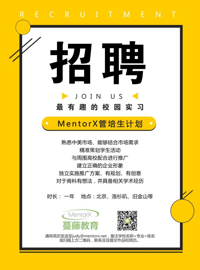 MentorX 管 培 生 计 划 我 们 是 谁 蔓藤教育MentorX是第一家中美跨境为中国留学生专业提供实现留学目标、孵化国际化就业和创业人才的互联网教育公司。我们致力于帮助中国留学生在美实习就职中答疑解惑。 我 们 要 的 你 01 项目内容 利用线上线下宣传渠道积极有效地传播蔓藤MentorX及企业文化 及时有效搜集反馈学校活动信息,并积极主动提出建设性意见 协助策划执行校园活动,为校园宣讲、招聘会等提供现场支持 帮助与高校老师、同学以及校园社团建立并保持良好的合作关系 其他促进校园招聘及校园关系的各类工作 02 要求 全美各高校在校学生,不限专业 热爱教育行业或科技产业,拥有投身教育、市场、技术等业务的初心与敏锐嗅觉,不惧挑战,追求个人价值实现与事业成功 强烈的好奇心与求知欲,具备逻辑化与多元化的思考方式 出色的沟通能力,擅长跨任务的协同与推进,拥有学生会/社团等经验者优先 03 管培生制度 管培生是管理培训生的简称,是外企里面“以培养公司未来领导者”为主要目标的特殊项目,所以能进入管培生项目,基本都是可以转正的。管理培训生制度有助于增加企业对最具领导潜能的人才吸引力,并有助于将其打造成最优秀的领导人才,使组织保持持久的竞争优势。 中小企业的管理培训生制度可以更快地对组织的业务产生战略性的影响。因此管理培训生制度对快速成长及有抱负的中小企业有着更加重要的意义。 MentorX的管理培训生计划是一个全球性人才发展项目,按照统一的标准和要求设计,在学生中选拔具有商业意识、发展潜力、成功决心和领导力潜质的优秀人才,将之培养成为与公司共同发展的各个领域的职业人才。 经选拔后,管培生们会进入为期一年的项目,进行部门内或跨部门轮岗,并且有机会经历中美两地实习,在各类定制化培训和具有挑战的工作中快速成长。 时长:一年 地点:北京、洛杉矶、旧金山等 你需要的,我们都有 奖金!收入!专业经历! 不再零经验,向专业领域迈进一大步 接触各行业最新消息,跟大佬一同学习 全球Offices实习机会 接触各类市场,开阔眼界 掌握别人碰不到的资源 如果你成为了管培生 我们需要你做什么? 策划联合周边各大高校举办线下活动参与新产品研发、试用,为技术部门提供反馈 配合销售团队进行产品营销,完成KPI 通过有效运营方式提升蔓藤品牌形象 我们期待你的加入 也期待你带来的精彩