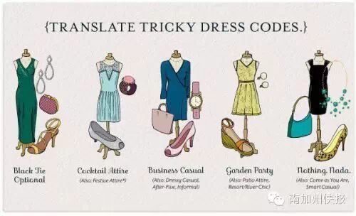 写在前面的话:虽然美国人平时穿着随意,T恤牛仔人字拖,看似不那么讲究,但这并不代表随意到底。其实美国人很讲究在不同场合穿适当的衣服,如果你 overdress 或underdress,就会很尴尬。要融入美国,了解美国着装礼仪很重要。