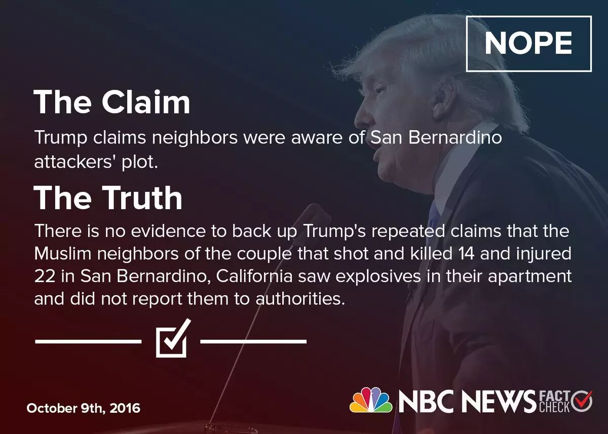 美国全国广播公司(NBC)所做的事实核查发现,川普不断重复称,圣巴蒂诺枪击案中嫌犯的穆斯林邻里提前知晓枪手的计划——这是错误的。没有证据证明这一点。Wrong!!