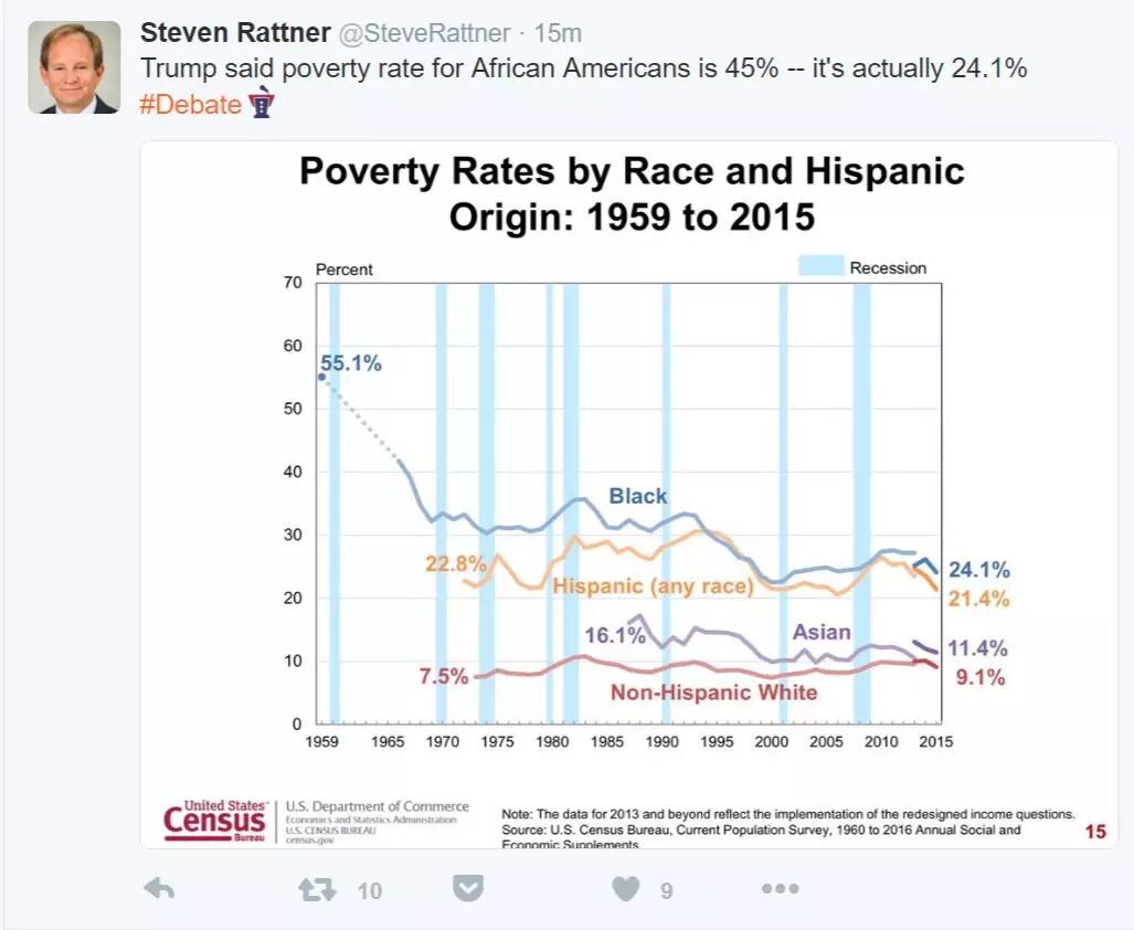 奥巴马政府的前白宫经济官员史蒂夫·兰特纳(Steve Rantter)说,川普称非裔美国人的贫困率是45%——这是错误的。根据美国统计局的数据,2015年非裔贫困率是24.1%。奥巴马任期的过去7年中,也从未达到过45%。Wrong!!!