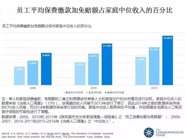 当将保费缴款和免赔额相加时,2015年拥有雇主资助医疗保险的美国家庭平均潜在医疗成本负担为6,422美元,大大高于2006年的3531美元。这意味着2015年中等收入家庭将10.1%的收入用于医保和医疗,而10年前这一数字仅为6.5%。