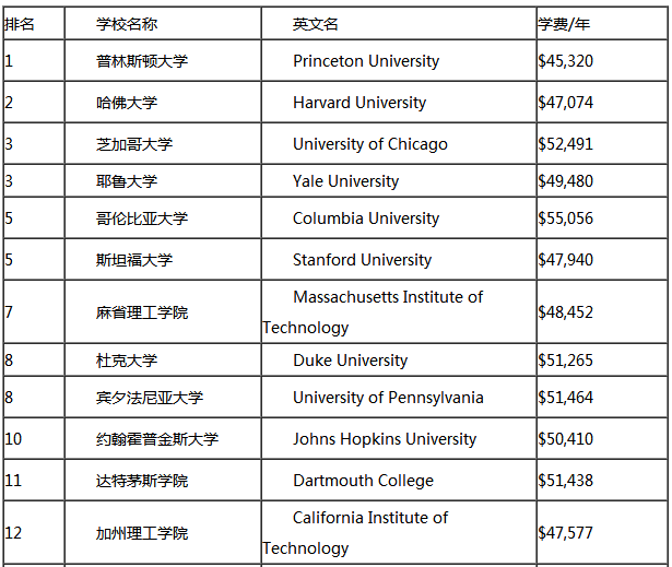 让我们先来看看美国大学学费排行榜前12名的情况。