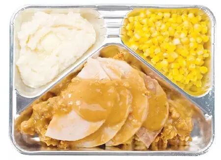 1953年,在美国斯万森的某公司严重错误地估计了美国人民在感恩节消耗火鸡的数量。面对卖不掉的260吨冰冻火鸡,该公司的销售员盖瑞汤玛斯定来5000个铝质餐盒和一个生产线的妇女,帮忙把火鸡肉切碎、分装,再配上甜玉米、青豆和土豆——就此创造了全世界第一盒冰冻简餐。汤玛斯说他的灵感来源于飞机餐。
