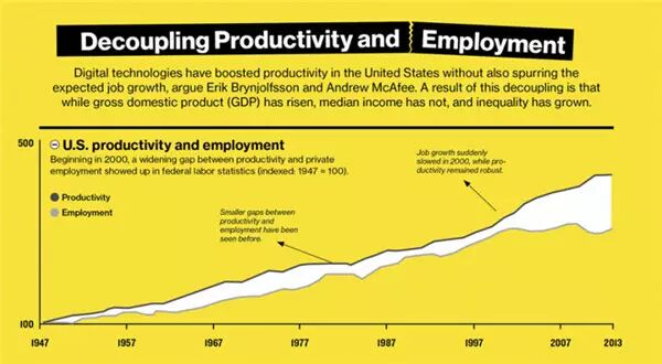 以美国为例,美国的制造业工作岗位比例已经从1970年的25%下降至今天的10%,受人工智能或者说机器人的影响,该行业的岗位数量和就业率一直在上下波动,直到21世纪初,其岗位增加速度显著放缓,而就业率更是停滞不前,二者之间的差异正说明人类正慢慢被机器人所取代。