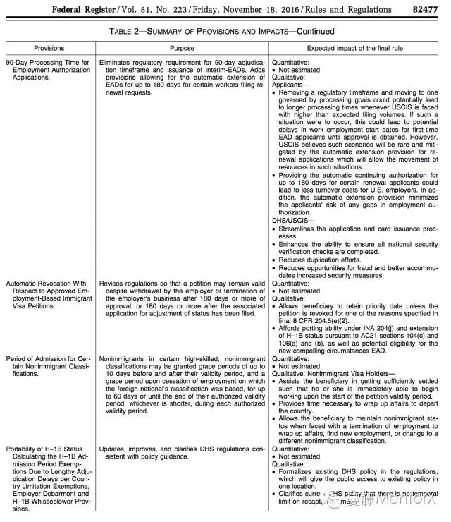 USCIS今天公布了一份关于职业移民的最终规定。 下面就来看看小编为你画出的政策重点: 1、H-1B,L-1,O-1等外籍员工新增60天的事业Grace Period。 2. I-140被批准后雇主不得撤退。 3. 在不可抗拒的特殊情况下才能申请I-140 EAD工卡。 此规定公示60天后,将于明年1月17日生效。 自川普当选美国总统以来,有关他将推行强硬移民政策的猜想就在全美甚嚣尘上。诸如“取消H1b”、“职业移民绿卡更难”等传言四起。 而DHS于18日公布针对职业移民及工作签证等非移民工作签证持有者的利好法令,似乎是要赶在新政府上台前解决“历史遗留”问题。 那么,移民局和国土安全部正式在Federal Register网站公布的这份题为《Retention of EB–1, EB–2, and EB–3 Immigrant Workers and Program Improvements Affecting High-Skilled Nonimmigrant Workers 》的最终规定,究竟讲了哪些内容呢? 1 多类工作签证新增Grace Period 持有H-1、L-1、O-1、E类签证(不适用于中国公民)以及TN签证(不适用于中国公民)的外籍员工及其附属签证家属可以享受一次性最高60天的grace period。 签证持有人可以利用这段时间寻找另外的工作机会延续在美合法身份,这也许是本次提案中影响范围最广、受益人最多的一条细则。目前,持有非移民类工作签证的外籍人士,一旦失去工作就会立即失去有效身份,这条细则大大缓解了一失业就要尽快离境的尴尬局面。 另外,grace period可以使用多次。每一个以上的非移民身份有效期到期后都可以使用一次grace period,但处于grace period期间的外籍人士不能在美国合法工作。 2 关于I-140获批后雇主撤销I-140的可能性 如果外籍员工的I-140职业移民绿卡申请已经被批准,那么即使雇主要求撤销,也不能够被自动废除。 另外,在I-140批准后的180天或者I-485身份调整递交后的180天后,雇主公司一旦倒闭或停运,外籍员工已经批准的I-140也不会被自动撤销。但是,如果被国土安全部查出存在签证欺诈、伪造材料等行为,外籍雇员是无法继续保留已批准的I-140的。 I-140表格是正式名称为外籍劳工移民申请(Immigrant Petition for Alien Worker),是美国雇主向美国公民及移民服务局提交的一种文件,该文件旨在为其外籍雇员申请永久的移民身份。 3 不可抗拒的特殊情况下才能申请I-140 EAD工卡 如果满足下面这些条件,那么I-140被批准的受益人及其家属才可以申请一年的工作许可: 是H-1B、L-1、O-1、E-3、H-1B1身份或在相应grace period期间内的非移民申请人; I-140被批准的受益人由于其国家限制无法获得移民签证号码。 I-140被批准的受益人必须说明自己身处何种特殊情况以致需要申请该工作许可。 在最终规定中,国土安全部并未给出“特殊情况(compelling circumstances)”的具体定义,但说明了在以下情况可能会授权该工作许可,包括但不限于: 严重疾病或残疾 雇主纠纷或保护 申请人及其家庭会遭受实质性损害 对雇主的重大干扰 这份新政出台的初衷是为了弥补现行职业移民法规中的不足,一方面为美国雇主行方便,使其能够更加便捷的为优质外籍员工申办绿卡、留住人才,另一方面也为外籍员工考虑,力图打造更稳定的就业环境、也试图增大更换雇主的灵活性。 除上述几个影响力大、范围较广的规定外,政策中还涵盖了进一步定义H-1B的6年后延期使用规则、进一步细化H-1B免抽签适用范围等内容,感兴趣的小伙伴可前往: https://www.gpo.gov/fdsys/pkg/FR-2016-11-18/pdf/2016-27540.pdf (或点击阅读原文)查看政策原文 文章选自世界日报,由MentorX编辑整理完成。