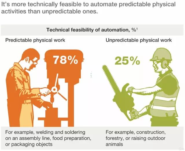 这类工作比可预测环境下的工作要求更高的灵活性,因此仅用现阶段的技术相对更难实现自动化,其自动化潜力为25%。不过,也有一些工作更容易引入自动化技术,比如农业(如评估作物质量)和建筑业(把建筑蓝图化为具体的作业要求)。