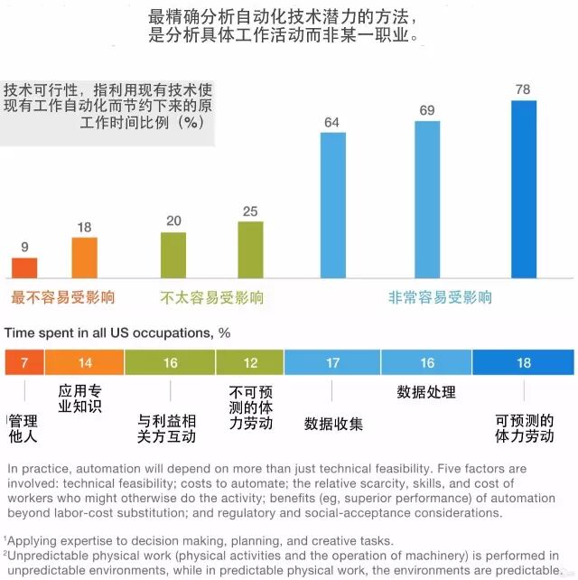 去年,我们曾撰文阐明,现有的技术能够使45%的工作自动化;60%的不同职业中,至少30%的工作能够被机器和现有的技术取代。在本文中,我们将按被自动化技术取代的难易程度把工作分成三类:非常容易受影响(highly susceptible)、不太容易受影响(less susceptible)、最不容易受影响(least susceptible)。在每一类里,我们将分别讨论在哪些部门和职业里,机器人和机器最容易取代人工。文章结尾将讨论当今发展势头迅猛的技术(比如自然语言生成)将如何改变我们的未来,对于企业高管又有什么启示。