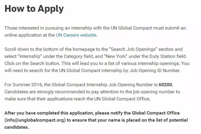申请者实习期间需为在读本科生或研究生,特殊情况下,毕业一年之内的毕业生也可申请。不限国籍。实习地点位于纽约,无薪实习,交通及住宿等各项费用需自理。实习期为3-6个月,实习时间灵活,夏季或秋季实习期从8月至11月,冬季或春季实习期为1月至5月。2016年夏季实习(7-12月)申请截止至6月29日。详情戳https://www.unglobalcompact.org/about/opportunities/internships