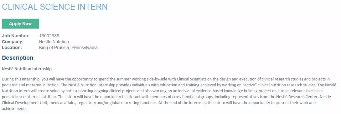 雀巢集团旗下雀巢营养最新暑期实习项目开始,实习领域为临床科学,主要进行儿童和孕产妇营养产品项目的研究和开发。实习地点为宾夕法尼亚州蒙哥马利郡普王市(King of Prussia)。