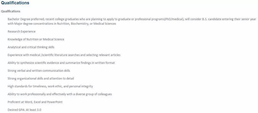 申请条件为:本科学历优先,营养、生物化学或医学专业优先,GPA不低于3.0,有一定研究经验,具备良好的分析和批判性思维能力,有良好的沟通技巧和表达能力,能够熟练运用Word, Excel, and PowerPoint等软件。不限国籍,无薪实习,实习为兼职,每周工作32-35h,至少八周。详情戳https://www.nestlejobs.com/job/king-of-prussia/clinical-science-intern/806/1989102
