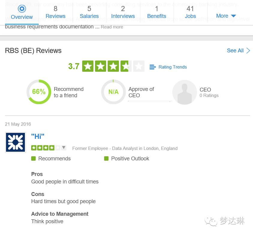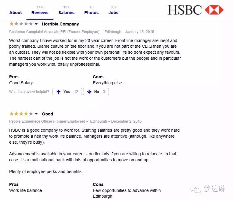 Company research,是绝大多数同学们找工作的第一步。除了了解公司历史、业务、文化、部门等常规内容来应付面试外,同学们也应更加主动更加自信地问问:这家公司声誉和口碑如何?值不值得我投入?如何判断网上信息哪些可信哪些不可信? 互联网上有大量论坛和多种平台供求职者们交流互动,海量的信息有些来自公司官方宣传材料、有些来自应聘失利者、有些来自真正的公司员工、有些则是无关网民自发加入讨论发表观点……对于即将进入职场的同学们来说,面对这些,同学们一定要独立思考,带着批判性思维看待各方言论。我们为大家举例说明。 同样工作内容,雇员会有截然相反的评价 以上两则截屏,两名雇员对HSBC做出了几乎相反的评论。然而他们真正的经历或许是非常相近的,区别主要来自于个人感受上的差别。 我们可以大胆猜测前者当时应该是初入职场,获得了高薪的工作机会很激动,十分期待系统完备的培训,渴望得到关注及帮助,追求在工作中表现出专业姿态。也许是碰到的经理确实做得不够好,但这位给出评论的这位年轻人当时心中的参考对象又是谁呢?在缺少工作经验的情况,要么是想象,要么是影视剧中的人物形象,那些标准要在现实里一一兑现可不容易啊。 紧接着的这则评论中同样提到经理工作繁忙,但知道这是职场常态。工作不轻松,但对公司能主张员工去平衡生活表示了感恩。抱着这样的心态,工作体验当然不会太糟。至于Ta认为的缺点: 在固定办公点的升职空间有限,也并不是所有人共同困扰。还没有安家的年轻人很多都不在意为了升职搬家吧。 由此可见,好评、差评都是针对个人而言的,最重要的是了解是否适合自己。 Pros and Cons 因人而异 从这个非常简单的评价中可以发现,知名咨询公司埃森哲的一位在职的分析师认为公司福利不错,但是工作中经常遇到变化。如果你追求稳定的工作环境,恐怕这不会是理想的平台。但在一些灵活性高的人看来,这完全不是个困扰。大家看评论的时候一定要注意具体讨论的点而不要全盘接受一个结论。 最后这则同样耐人寻味。RBS团队气氛似乎不错,同侪给力,但工作整体压力好像很大。所谓”环境艰苦”不知道具体所指是项目难度大、时间紧张,还是没有任务,大家等着干着急呢?最后的建议是希望公司管理者多看积极面,换言之,ta感受到更多消极的力量。也许是批评多于鼓励,也许是上级忽视大家的进步。如果你善于在压力环境下工作,性格乐观、弹性强,懂得自我激励且有感染力,也许会为这个团队带来更多希望。不仅自己不苦,还能带活气氛。