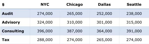 总体来说,四大的合作伙伴的收入将在25万到500万美金之间,而平均合伙人在他们的职业生涯中可能会赚取近1200万美金。对于合伙人来说,并不存在地区差异,因为他们并非赚取典型的工资,而是基于他们的业务能力。