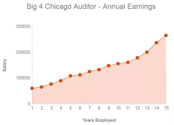 我们以芝加哥的审计员为例。以下为各个阶段,你会赚的薪资。