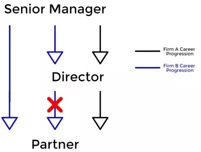 对于一些公司来说(如B公司),高级经理之后会有两条路径。合伙人以及受薪合伙人,这两者之间的区别在于,受薪合伙人并不拥有公司的任何股权。