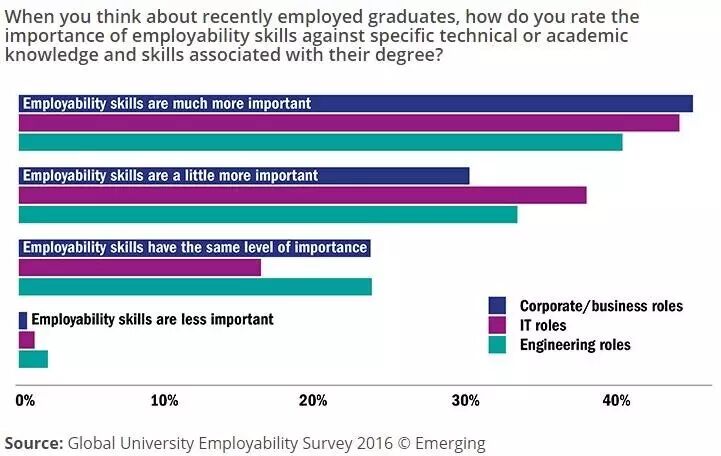 另外,当被要求比较就业能力和学术水平的重要性时,大部分的企业管理层表示,对公司而言,招收毕业生时,就业能力在测评中的比重要高于学术水平!