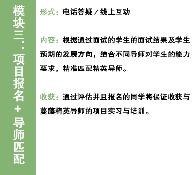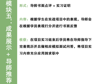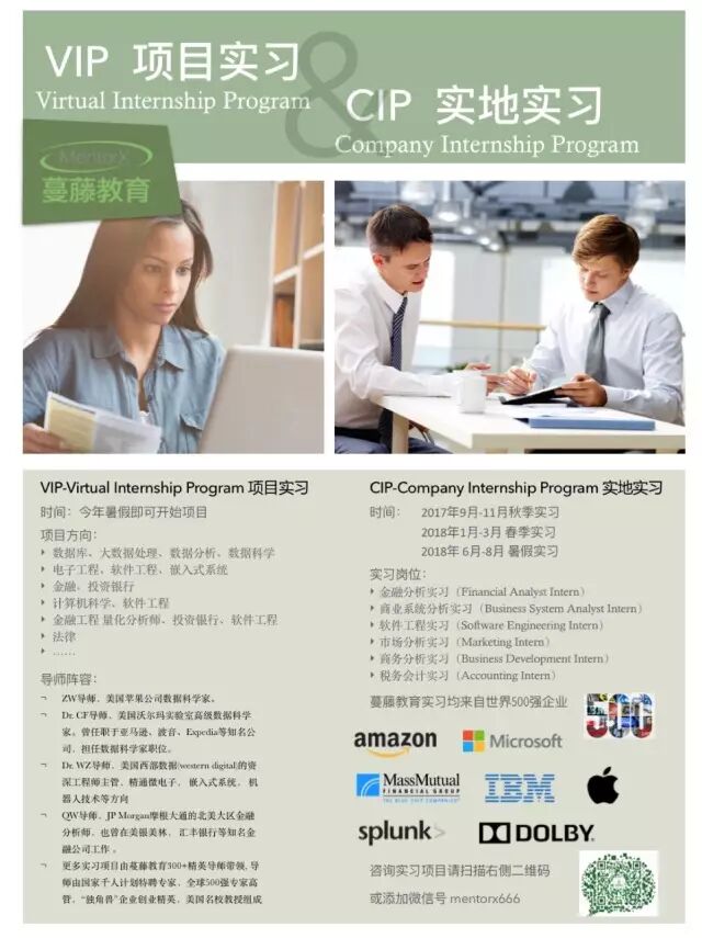 假期,才是提升自己的黄金时期。 暑假时间很长 所以我们必须要有合理的目标 但若按时间去划分每天应做的事 这是非常低效率的方法 而且往往不成功 因此 首先我们要建立一个目标金字塔 目标可分为不同种类: 终极目标、长期目标、中期目标、短期目标、小目标 这么多的目标并非处于同一个位置上 它们的关系就像一座金字塔 ? 所以如果我们一步一步实现各层目标 自然取得成功会相对容易 反之则异常困难 然后我们应该把每一个小目标划分到假期中 对于留学生而言 读书最大的目标莫过于在美国可以找到一份实习和工作了! 那么我们来看一下 如果这个目标是 希望在毕业后进入大公司 这个目标看起来很大,尤其对于没有实习过的同学,第一份实习和工作尤为困难! 原因很简单! 雇主看一眼你的简历,过去没有任何实践经历,白纸一张! 雇主最看重毕业生的地方是 过去的实习经历 与真正解决问题的能力 而不仅仅是GPA 所以你想给雇主展现的,是你已经有所学专业的实践经历,即项目实习 Project Experience 这样你的“找实习”的大目标 可以从一个项目实习开始 原因很简单! 因为它周期短,你可以在6周内快速上手一项技能并学会它在企业的应用 (比如python, Hadoop, ERP Financial Accounting, M&A, Derivative Pricing...) Q:那我可以参与哪些项目呢? 项目实习是针对各个专业的同学,无论你是学商科、计算机科学、工程,还是传媒、环境、科学、物流、法律,蔓藤教育相关领域的导师都可以带你来做项目! (详细项目列表见下) Q:我为什么要和蔓藤教育的导师一起做项目? 蔓藤教育的VIP远程实习(Virtual Internship Program)旨在为还没有找到暑假实习的广大留学生提供一个与专业导师项目培训和学习、实战、提升的平台。 VIP的项目由世界500强企业的内部培训为基础,针对留学生的特点以及面试时的考查重点,为中国学生量身打造的远程实习项目。项目结束后学生将得到实习证明。 Q:蔓藤教育的项目实习有什么优势? 1、500强导师亲自指导 蔓藤教育VIP远程实习是由蔓藤教育精英导师倾力打造,行业最高标准的项目实习!蔓藤导师来自国家“千人计划”特聘专家、全球500强的专家和高管、“独角兽”的创业精英和美国名校教授。 2、高实战与应用性 通过项目实习你将学习到企业中常用的软件与应用技能(而非学校所教),在短时间内得到专业的强化辅导与提升。 3、时间适中,形式灵活 项目实习周期是6周,对于暑假还没有实习,希望通过远程实习(与导师一对一做项目)来提高自己的同学,这是你的不二之选! 蔓藤精英导师团队介绍(部分) 项目流程 项目内容介绍 让蔓藤导师暑假带你飞 6周帮助你专业与职场技能大飞跃! 项目涉及以下方向 一 商科- 金融类 二 商科- 市场类 三 商科- 商业分析类 四 商科- 人力资源 五 IT与电子工程类 六 机械工程类 七 生物工程类 八 环境科学 九 物流运输类 十 法律类 项目&公司介绍 IT与电子工程类? 1 Python游戏设计 - 金融与金工行业入门(IT & 金融类) 项目导师所在公司:美国银行 2 URL Shortener - Tech行业入门(电子计算机类) 项目导师所在公司:三星 3 大数据处理,数据分析 (Data Science类) 项目导师所在机构:斯坦福研究中心 4 Electrical Engineering Algorithm FFT 电子工程算法应用 (电子工程类) 项目导师所在公司:西部电子 5 ERP Financials and Accounting Introduction (计算机工程,大数据) 项目导师所在公司:德勤 6 控制模式项目 (电子工程类) 项目导师所在公司:德州仪器 金融类项目主题? 1 Costco批发公司的估值项目(金融类) 项目导师所在公司:好市多 2 摩根大通金融衍生品定价 并购(M&A)+杠杆收购(LBO) 项目导师所在公司:摩根斯坦利 3 特斯拉金融分析 项目导师所在公司:特斯拉 4 高盛固定收益产品,估值与分析 项目导师所在公司:高盛 5 美林证券组合管理 项目导师所在公司:美林 更多专业项目本周将于大家见面...... 项目亮点 1、为学员所匹配的职位,如数据分析师、科学家、金融分析师、软件开发员等职位提供进入就业市场所需的最有用的技能和直觉。 2、此项目的重点在于导师将帮助学员了解所教技能与知识再日常工作中的应用及重要事项。 3、通过项目实习学员将在实战中获得自我学习与提升的方法,以及面对分析任务时如何阅读和查找资源的能力。 4、该项目为学员模拟真实工作环境,并且在5-6个周内学会指定技能,并且了解技能在行业的最佳使用方式。 申请条件 Ø 专业要求:相关专业 Ø 年级要求:大一及以上 & 研一 Ø GPA要求:3.0以上 咨询及报名方式 关注蔓藤教育 并回复【 VIP 】 立刻查看项目咨询方式