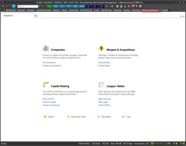 FactSet是全球各地投资管理和投资银行专业人士,分析财务数据的应用程序领先供应商。尤其,它在在投行中的使用非常普遍,据投行内部员介绍,Factset的使用频率是:daily basis。个性化的界面,强大的功能,excel plugin也不差。 在投行工作,你必须学会使用FactSet。因为据投行内部员工介绍,FactSet的使用频率不亚于你的一日三餐。简直就是:daily basis。 FactSet的功能也极为强大,如果你想说它只是Bloomberg的替代品,那你就大错特错了。FactSet核心的优势主要集中在公司的财务数据,这方面完爆B和R几条街。这也是为什么投行analyst的必备技能的原因之一。 简单概括来讲,“熟练使用FactSet”应该包括: 这是FactSet的使用的核心,Excel 里的 FactSet Add-Ins 也是建立在Workstation的基础上运行的。当你插入一个公式,并且进行运算时必须保持与Workstation的链接畅通。 Workstation的图形界面和已预先配置好的各个Tab(就是上图中的一排My Market, Research, Portfolio...)可以直观地给出一个初步的引导:你可以从这里获取什么信息。 从结构上讲,打开一个Workstation,你就打开了一个Workspace, 对于初次使用者,可以从众多的FactSet预置的Workspace中挑选一个使用。因为你刚打开的时候是一片空白。可能你真的会接到这样的客户电话,问,"你们的Workstation什么东西也没有,怎么办?” 最前面展示Workstation的时候其实选取的就是这个界面。 这个图说简单点就是Americas市场各个Index的当前价格,最高/低价,价格变动等等,当然每个Tab之间的互动性也在于你右键一个指数,比如S&P 500, 就可以导航去到别的你感兴趣的方面。 接下来说说我觉得最有用的Tab。从名字看,这是一个获取上市公司信息的地方,但其实它可以提供的远远不止这些: 所谓的Ticker对于有点金融股票知识的人来讲应该不难理解。就比如苹果公司,很多同学永远记不住它究竟是APPL-US还是APLL-US,所以你每次就可以这样: 再回过头看看这张图,前面所说的“提供的远远不止这些”,奥妙也在这里了。不仅仅上市公司,包括私有公司,PE/VC,债券,Mutual Fund,ETF,Indices,Commodities等等,几乎所有FactSet所有的金融主体,全部可以在这里搜索到。除了宏观经济上面的一些数据,这个后面再将Excel Add-Ins的时候会提到。 这里显示的就是具体的财务数据。这些Fundamental的数据,主要来源于FactSet Fundamentals。 但同时FactSet也是一个开放的平台,与其他某些封闭系统不同,FactSet同时也提供其他一些Vendor的数据,比如Reuters,针对北美市场的Compustat North America等。 有基础财务数据,当然也有预测数据。还有各家broker提供的ratings。同理,预测数据的主要来源也是FactSet Estimates,但同时FactSet也提供其他数据上的数据,比如Reuters的I/B/E/S Consensus, First Call Estimates... 还有各家broker提供的ratings FactSet的产品确实并不是这么容易“熟练”,但是学会以上这些,其实你已经算是基本入门了。接下来再简单介绍几个用的频率比较高的Tabs。 Ownership 主要提供“持有”与"被持有"方面的信息。 以黑石集团(Blackstone)为例,首先作为一家公司,它的持股者的信息可以在Company Analysis下面看到,包括持股类型,持股比例,比例变动等等。而Ownership 2.0 非常好的一点是,同一家公司可以在”As a Company“与”As a Holder"两方之间进行切换: 在Holder Analysis里面,有各种对于Blackstone作为Holder的分析,比如下图的Sector Analysis等等。 这是用来筛选各类并购(M&A),风投(VC),IPO等各项交易的一个tab。 ▶ 以IPO为例: ▶ 然后,”View Results“ ▶ 这份Report的默认显示栏目是可以自己增减的,比如这样: 好了,以上就是Workstation的实践操作。福利接好! 转自知乎lilittleV