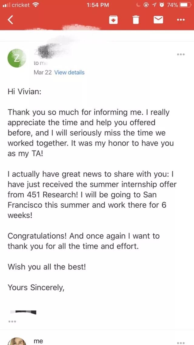 祝贺她,接下来将会在旧金山完成她为期六周的暑期实习啦!