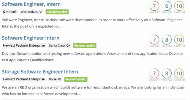 职场引擎会根据本地招聘同类岗位的公司的薪金待遇(Salary Index)、历年招聘留学生的数量(Hiring Index)以及本岗位在此公司的发展前景(Career Index)为你打分