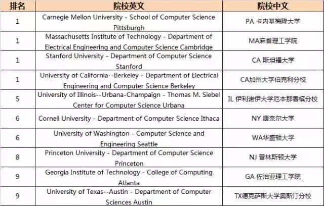 根据2017US News,CS专业前十名院校如下