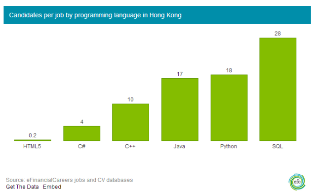作为香港金融机构,特别是私人银行,更多地投资于移动应用程序和其他的在线客服平台,HTML5 是在我们的图表中排名第一的语言。而西方市场供应充足的 HTML5 的求职者,亚洲的需求只在过去的12个月有飙升,之后就寥寥无几。“很多下一代银行平台现在使用 HTML5 的前端,” 寻找亚洲公司精确定位的香港猎头公司的负责人 Vince Natteri 说。