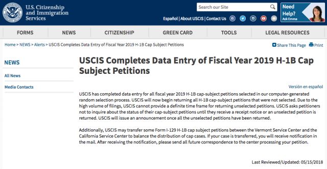 (图片来源:USCIS官网) 就在今天的早些时候,移民局官方网站USCIS发布了其最新的消息:2019财年的H-1B申请信息已全部完成录入。移民局会从今天开始退回没有被抽中的包裹。 被抽中H1B的申请者将收到Receipt Notice。而没有被抽中的同学们将收到被退回的申请Case。 包含申请费的所有申请文件及费用将被原封不动地退回,届时收到包裹的人也将得到宣判:今年与H1B无缘。 这大概是天天等着收包裹的你最不想收到的包裹了。 那么在现在还没有等到H1B Receipt Notice的同学真的就注定与H1B无缘了吗? 小编在这里想对大家说,虽然现在看来,没有抽中的可能性确实更大,但这并不代表100%没有抽中。从已往的经验看来,在移民局公布录入结束后,接下来的一到两周内依然会有学生可能收到移民局的受理收据(receipt notice)。而且,往年也发生过收到收据后申请支票才被兑现的情况,所以即使到今天支票也没有被兑现的小伙伴也无需完全放弃希望! 那么,确定已经抽中H1B的小伙伴是不是就可以无忧无虑地开始工作了呢?也不是!!在此,小编要特意提醒同学们,对于OPT将于2018年9月30日之前截至的同学们,一定要确定自己的OPT有被延期。如果OPT的时间并没有被延期到9月30日的同学请务必通过学校申请延长。 最后小编还是想再次提醒那些希望毕业后留在美国工作的留学神千万不要错过了申请OPT的时间节点: OPT的申请时间为毕业前的90天到毕业后的60天,60天之后,你将失去申请OPT的机会,并且需要出境。 OPT申请后,需要等待下发EAD卡,方可开始实习。由于获得EAD卡一般需要2个月的时间,越早申请,获得EAD核准越快。 所以大家要尽早开始准备你的OPT哦! 很多来找我们咨询工作岗位的同学也都是因为没有提前准备OPT而丧失了在美国的求职机会! 最后!祝愿大家H1B都中签!接下来升职加薪!! 免费咨询方式 小蔓 添加了解更多实习、全职项目详情 小声告诉大家,小蔓抽中签了,希望好运能传递给大家哦 本文为蔓藤教育原创文章,未经授权请勿转载 如需转载请在后台留言 排版:Leah