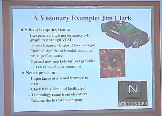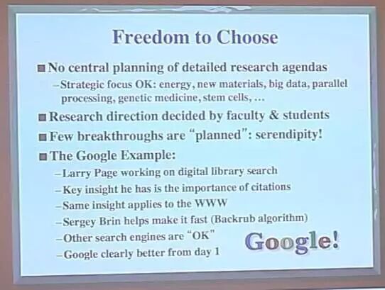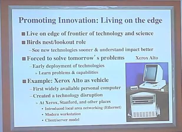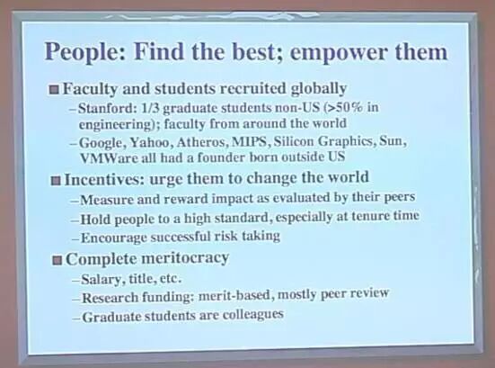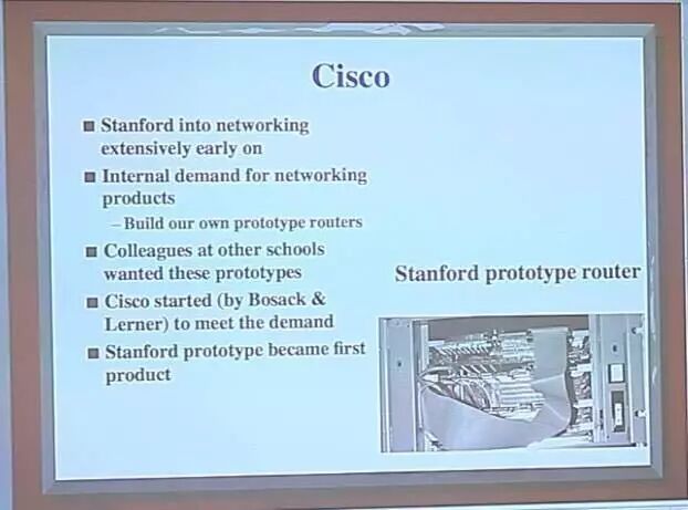 导语 斯坦福大学是众多伟大创新的起源地。 斯坦福为硅谷的形成和崛起奠定了坚实的基础,培养了众多高科技公司的领导者,这其中就包括谷歌、惠普、雅虎、耐克、罗技、特斯拉、Firefox、艺电、Sun、NVIDIA、思科、及eBay等公司的创始人。 据统计,截止至2016年斯坦福共有60位诺贝尔奖得主。此外共有20位斯坦福校友或教授获得图灵奖(计算机界最高奖);另有7位斯坦福教授获得过菲尔兹奖(数学界最高奖)。斯坦福出身的企业界人士遍布硅谷和美国,政界人士也是数不胜数。斯坦福大学是名副其实的硅谷与美国的智慧之源泉。 ◾ 斯坦福大学背后的秘密是是什么? ◾ 是什么让斯坦福成为硅谷的心脏? ◾ 是什么让斯坦福和硅谷的创新系统发生化学反应的? 硅谷密探携手长城会创始人、董事长文厨,带大家一起走进《小邮差看世界》第二期节目——斯坦福前校长约翰·亨尼斯。约翰.亨尼斯是美国计算机科学家、MIPS公司创始人,被马克安.德森誉为“硅谷教父”。 为了揭秘斯坦福大学的成功秘密,斯坦福前校长从科技讲起: 科研和创新一直是经济增长的引擎 历史反复证明,新的突破性技术会带来一个全新的行业。 贝尔实验室的半导体技术的突破,和接下来的仙童和德州仪器等公司的成果,创造了半导体这个如今每年3千多亿美元的行业。 大型工作站和个人电脑行业的发展,直接起源于施乐帕罗奥多研究中心、斯坦福、伯克利等机构的研究成果。 互联网和Web技术甚至生物医药技术背后也是由研究驱动。而每个行业的发展也创造更多技术进步的机会。 那么高校在科研创新中扮演了什么样的角色呢? 高校长期是创新的源泉 高校长期以来坚持基础研究和原创性研究,这是科技创新的源泉,任何科学技术的重大突破都离不开基础理论支撑,没有基础研究和原创性研究,创新不会有很强的活力和后劲。 高校人才济济,与学术圈交流频繁,创造性气氛浓厚 ,在基础研究和前瞻性课题方面具有工业企业不可比拟的优势。 工业界的科研活动很难考虑中长期的需求,所以目前来看工业界对长期科研项目的投入在减少或者转向。 长期性的科研成果的收益者往往会是整个行业和社会,在这种认识下高校作为创新源泉的作用在增加。 更重要的是,大学是人才的聚集地 以Google为例,拉里.佩奇和谢尔盖.布林创办Google后,有成百上千人从斯坦福加入谷歌,这些人才是Google崛起的关键。 斯坦福的秘密武器 那么斯坦福是如何在硅谷崛起的过程中扮演关键角色的呢,斯坦福老校长讲了两个关键, ▪ 第一是斯坦福如何在学校内提倡创新, ▪ 第二则是斯坦福如何将科研成果转化为产品。 斯坦福大学如何在学校内鼓励创新? 最关键的是人! 约翰·亨尼斯表示创新需要几类人: 有远见的预言者 探索者 无畏的执行者 有远见的预言者能够看到一项技术可能带来的革命性变化,他们能够从一而终,致力于将新技术的使用门槛降低,通过各种方式将成本降低、把新技术普及。 革命性的技术出来后,大家可能都不清楚应用场景和机会在哪里,探索者就会通过各种尝试将新技术应用于可能的场景。 无畏的执行者则是通过不懈的努力将愿景变成现实。 有远见的预言者的典型例子是吉姆·克拉克,吉姆·克拉克是斯坦福大学电机系副教授,他的天才在于他洞察未来发展趋势的才能。一旦捕捉到趋势,就果断地创建公司,并组织一批人才进行开拓。 在看到图形技术特别是3D图形技术的巨大潜力后,在1982年他创办了利用软件和硬件加速来显示3D图像的公司SGI,SGI成为世界领先的好莱坞视觉特效和3D图像生产商,成了整个3D行业的缔造者。 1993年在看到图形浏览器的巨大潜力后,克拉克找到了Mosaic的开发者马克·安德森,这是互联网上第一个普及和易于使用的浏览器。克拉克和安德森一起创立了网景通信公司。网景于1996年IPO,克拉克的500万美元的投资赚到了20亿美元的收益。 站在最新技术的前沿 约翰·亨尼斯认为,只有在最新技术的边缘,才能更好地看到未来。 在斯坦福,众多科研人员是科技的哨兵,会看到各种早期技术的萌芽和发展,迫使自己思考更多未来的问题。 而他也举了施乐帕罗奥多研究中心的例子,这里是许多现代计算机技术的诞生地,一个典型的例子就是Xerox Alto(施乐奥托电脑),Xerox Alto电脑于1973年3月1日首度公开,它是最早使用图形用户界面(GUI)的电脑之一,最早的个人电脑原型。 但Xerox Alto不是一个商业化量产的产品,价格高达1万5千到2万美元,后来苹果和微软都“借鉴”了Xerox Alto的设计。 另外一个例子就是思科,思科创始人是斯坦福大学的一对教师夫妇,夫妇二人设计了叫做“多协议路由器”的联网设备,用于斯坦福校园网络(SUNet),将校园内不兼容的计算机局域网集成在一起,形成一个统一的网络。 约翰·亨尼斯开玩笑说最早斯坦福用的是“鞋子网络”,大家用硬盘装着文件在各个实验室间跑动来传输文件,而有了思科的设备后,联网时代真正的到来了。 站在技术前沿的思科,把这项技术推广到了全球。 约翰·亨尼斯讲的另外一个例子则是Yahoo!的故事,Yahoo!创始人杨致远和大卫·费罗都是斯坦福研究生,他们创建了一个名为“杰瑞的网络指南”(Jerry's Guide to the World Wide Web)的网站,是一个信息索引网站,后改名为Yahoo!。 Yahoo!最大的成就是商业模式的创新,他们首创了互联网广告这种商业模式,是互联网商业模式