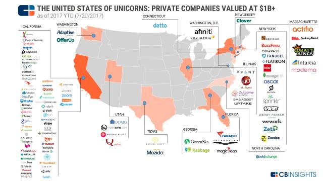 美国是105家市值超过10亿的独角兽公司们的天堂。截止到2017年7月25号为止,6家私营的美国公司超过了100亿。市值最高的两个美国独角兽公司是Uber(680亿)和Airbnb(293亿)。Palantir科技和WeWork,这两个市值约200亿的公司,也在榜单上。
