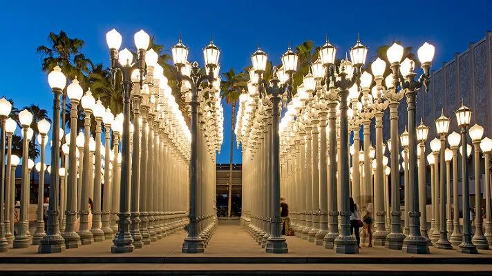 这片路灯可谓是LACMA的网红景点,不分中外,只要是网红都会来这里打个卡,为自己的相册加几分艺术气息。在博物馆里享受了一天的艺术熏陶,等到夜晚天气凉爽了再出来拍拍照,时间分配刚刚好。