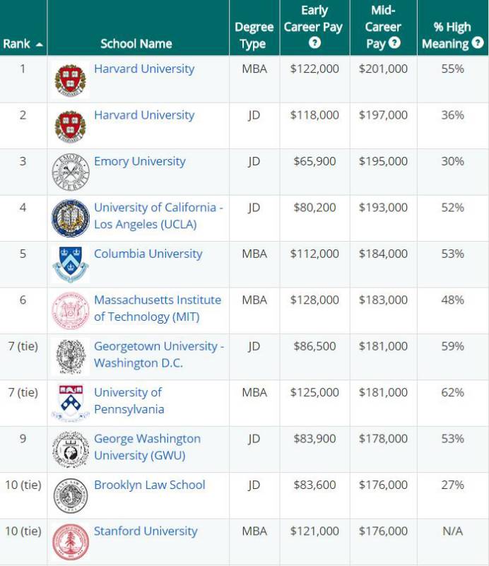 专业学校选得好,拥有硕士学位意味着工资比本科生高一个档次,甚至直接翻番。显然,法学博士和MBA占据了榜单前十。埃莫里大学法学院意外打败一些名牌法学院。想快速收回学费你投资,读一个有名气的商学院MBA的确是明智选择。