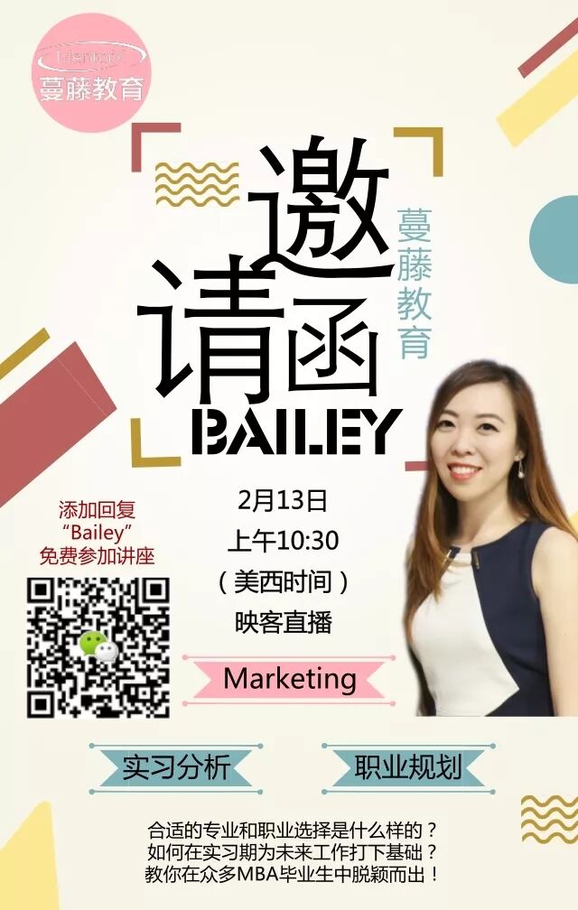 她是谁? Bailey老师 蔓藤教育职规师 2011年毕业于澳门大学传媒专业 2013年毕业于UCR MBA 在找工作的道路上, 她和你们一样, 但她将用亲身经历告诉你, 如何赢在起跑线上! Q:为什么来美国? A: 我的本科是在澳门大学读的,专业是传播学,方向是影视制作。其实我从上大学开始就决定要到美国来读研了。那个时候在澳门不管是从教育体制还是教学方式都非常西化,老师是美国人,教材是全英文的,上课演讲都用英语,在这样的环境下度过大学生涯实在对美国充满着向往。再加上大学时候比较活跃,什么拍电影,参加国际电影节、模拟联合国大会、演讲辩论比赛、教葡萄牙人中文、创办社团、组织港澳台学术交流会、还有Party...这段经历总结一句话那就是,“世界那么大,我要去看看”! Q:来美国读研的专业选择和感受? A: 虽然很早决定来美国但是面对专业选择的时候还是非常谨慎的,如果凭借兴趣去读传媒专业的话,一是自己的语言和文化背景与美国主流社会的差距颇大,二是即使在凤凰卫视实习过,广播电台工作过,但在国内的工作经历对于申请美国学校难度依然很大(求职也是这样,后面给大家解释),三是如果想凭借传媒作为职业在美国留下来,竞争非常激烈。所以在几经挑选后,决定选择MBA的Marketing方向(和传媒有契合之地)作为专业,并把Marketing作为自己毕业后的职业目标。 刚来美国的时候很自信,因为大学是英文授课嘛,觉得自己英文水平应该还可以。但来了之后才发现生活用语的障碍还是很大的。除了How Are You,I‘m Fine的现象屡试不爽,第一次去Subway点餐,站在那些新鲜的面包肉蔬菜色拉酱面前脑子里一片空白,完全不知道这些东西如何用英文表达,只能this that的先灰溜溜的填饱肚子。上课时候还好,但一到日常生活中就犯怵,办电话卡和去银行都要找华人工作人员来解决。后来我的一位本科就在美国读书的同学给了一个练口语的好方法:给AT&T(通讯公司)的客服打电话!他说,客服通常态度非常好,而且很愿意和客户沟通,为客户解决问题,于是我就“创造”出各种信号不好,网络不好,手机出问题了等理由,开始勇敢的练习英语。看起来是一段有趣的经历吧,但我也希望可以借此机会告诉同学们,做什么事想要做成都要踏出勇敢的第一步。 毕业 Q:读研时为了找工作做的一些准备? A: 在美国读MBA要求必须要有工作经历。我记得当时一位在USC MBA毕业的姐姐告诉我:从MBA开始的第一天,就要为找工作做准备了。虽然我没觉得有这么紧迫,但我还是会主动的去参加招聘会,同时也一直在网上投简历,投了很多很多,可结果并不好。我记得那时候收到的唯一一个回复,是一家在西雅图的学术类电商公司,那是一份远程无薪实习,主要负责校园拓展。说实话当时我觉得并不是很合意,但是有胜于无,既然机会来了就好好迎接它。远程实习对办公时间要求不高,每周和其他两个实习生开开会,然后去执行就好了。但这毕竟对我来说是第一个实习机会,所以在不上课的时候我都会保持着朝九晚五的工作状态。甚至在寒假为了这个实习我放弃了去夏威夷旅游的计划。虽然遗憾,但是你可能不知道这个实习为我接下来的求职产生了多大的影响。 这家公司的老板是位创业者,也是西雅图大学的教授,在实习过程中,他在创业和开拓市场方面给了我很多建议,当然也推荐我看了很多书,最最重要的是,我通过这段实习获得了他的推荐信和几位创业界的人脉资源,绝对的求职利器! “四大”是什么? 四大会计师事务所指世界上 著名的四个会计师事务所: 普华永道(PwC)、德勤(DTT)、 毕马威(KPMG)、安永(EY)。 所有会计专业的毕业生 都梦想进入这四大公司。 第二份实习是在KPMG北京总部进行的。这段经历本身是很让我自豪的,因为毕竟是四大嘛!然而理想很丰满,现实很骨感。在一场招聘会上我很激动的和KPMG在LA地区的经理介绍自己,然而他并不认可这段经历,只冷冷的说“中国企业的运营模式和美国企业是完全不同的”。当时尴尬癌就犯了,不断告诉自己你连美国企业实习经历都没有,哪儿来的自信啊?!不得不说我当时是非常后悔暑假的时候图省事没有选择在美国的一个小企业里实习,所以这个“悲惨”的故事也告诉想要毕业后留在美国并去大公司工作的的学生一个道理:能选择美国的实习就尽量不选择国内的实习。 正如那个面试官对我说:“你有过一段美国的实习经历,会让人觉得你勇于美国踏入社会。” Q:毕业后的第一份工作? A: MBA时候我的方向不是Marketing嘛,但是一直听大家说Accounting好找工作,女孩子适合做会计......于是我找到我的第一个实习老板求推荐,主动去找我的教授求推荐,还找到不少心动公司的邮箱猛发邮件求推荐,做了很多“厚脸皮”的事情,但是nothing to lose对吗?最后在推荐下很幸运的进入在LA的一家电商公司做会计。企业中的会计每天的工作是统计出账入账,处理订单,跟货物供应商沟通,稍微做一些social media的工作。这段经历对我来说是在美工作非常好的起步,但是对于个人发展来讲,并不是非常适合。我还是希望找到一个行业,能把过往的经历和学识融在一起的。 毕业后的第一份工作往往都找的不太顺利,网上投简历,去招聘会都没有音讯。很多学生有类似情况,但千万不要气馁。解决方案就是一定要提早有求职的意识,勇敢的走出去寻找机会。Networking非常重要,也要注意朋友的选择。我