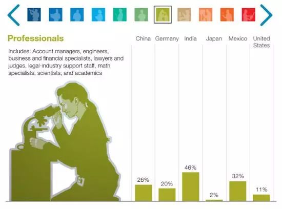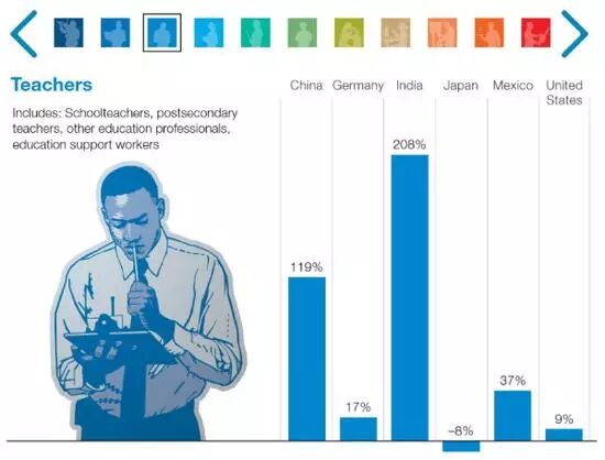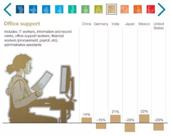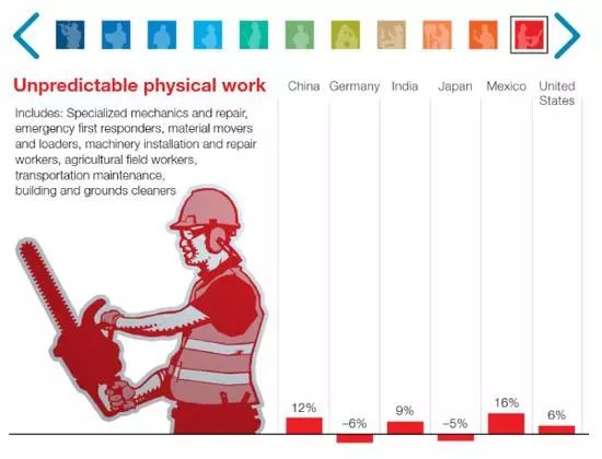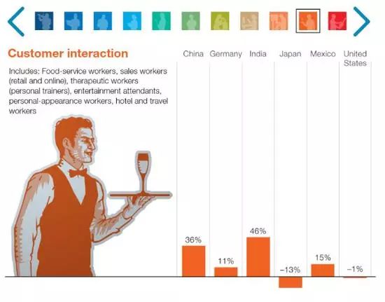 麦肯锡全球研究院(McKinsey Global Institute)在去年年末发布的报告中称,随着科技的进步,未来全球大概有3.75亿人口将面临重新就业,其中中国占1亿。 麦肯锡报告中分了11个行业大类,看不同国家未来在这些行业的岗位需要变化。其中涉及到创意工作、技术类工程师、管理类以及社会互动类的岗位需求增长明显,因为机器还无法在这些领域取代人类。另一方面,那些在可预测环境中进行护理活动的部分岗位需求将下降明显。 报告指出,按基本的市场供需关系,那些需求下降的岗位工资也将面临工资下降的窘境。与此同时,岗位学历要求将进一步提升,要求较低学历的岗位数将减少,大学乃至更高学历要求的岗位将增多。 01 02 03 另外值得注意的是,在不可预测环境下的一些相对低收入岗位,例如园艺工人、水管工、儿童和老人护理人员受自动化的程度也会较低。一方面由于他们的技能很难实现自动化,另一方面,由于这类岗位工资较低,而自动化成本又相对较高,因此推动这类劳动岗位自动化的动力较小。 2030年,最多将有1亿中国人将重新就业。 麦肯锡报告特别指出,被机器人取代并不意味着大量失业,因为新的就业岗位将被创造出来,人们应该提升工作技能来应对即将到来的就业大变迁时代。 报告指出,至2030年全球将有7500万至3.75亿人口重新就业并学习新的技能。从数量上看,中国将面临最大规模的就业变迁,预计将有1200万至1.02亿中国人需重新就业。 事实上,不同国家未来被自动化取代的岗位数,会受到经济发展预期、劳动力增长情况、工资水平等多重因素的影响。工资水平越高的国家越易受到自动化的影响,而随着经济的快速发展,劳动力总数若出现下降情况,未来将被自动化取代的岗位数便会更多。 麦肯锡报告还特别指出,在自动化的浪潮中,全社会需要解决好四个问题:一是需要保持积极的稳健增长,以保证工作岗位的增加;二是提供工作培训机会,帮助个人学习适应市场需求的新技能;三是提高商业社会乃至劳动力市场的活力和流动性;四是为那些被自动化取代的工人提供收入和重新就业帮助。 总而言之,对于每个个人来说,需要对未来高速发展的工作环境提前做好准备,努力掌握适应市场需求的新技能。未来对于人类而非机器的岗位需求将持续存在,但人们也应重新思考传统的工作方式还是否可行。 免费咨询方式 小蔓 添加了解更多实习、全职项目详情 担心未来会没工作的小蔓 免责声明:我们尊重原创,也注重分享。 版权原作者所有,如有侵犯您的权益请及时联系,我们将第一时间删除。 排版:Leah在创意人员(艺术家、设计师、娱乐业从业者、媒体工作者)大类中,中国岗位需求将增长85%。(以下11张图中的柱形图从左至右代表的国家分别为中国、德国、印度、日本、墨西哥以及美国)