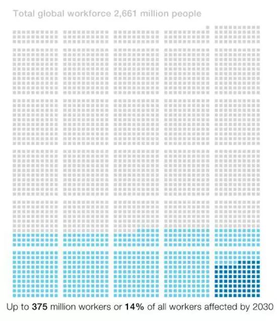 注:本图代表全球26.6亿工作人口中,最多将有3.75亿人的工作被影响,需要重新就业。