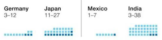 注:从左至右国家分别:德国、日本、墨西哥以及印度。浅蓝色方块表示在自动化发展迅速的情况下,各国分别将有1200万、2700万、700万、3800万的人口将需要重新就业并学习新的技能;深蓝色方块表示在自动化发展相对缓和的情况下,各国分别将有300万、1100万、100万、300万人需重新就业。