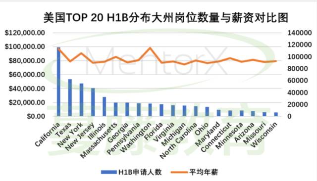 但是,美国蔓藤教育通过对美国TOP 20 H1B(美国工作签证)分布各州岗位数量与薪资对比图分析显示,在为国际学生提供H1B工作机会方面,加州、德州、纽约州名列前三。
