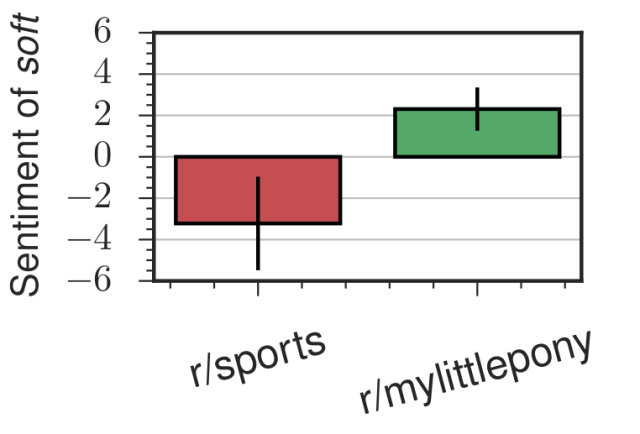例如,一个斯坦福大学的研究小组研究了不同Reddit论坛区中所使用的相同词语是否具有不同的含义。这里有一个关于“soft”一词的例子: