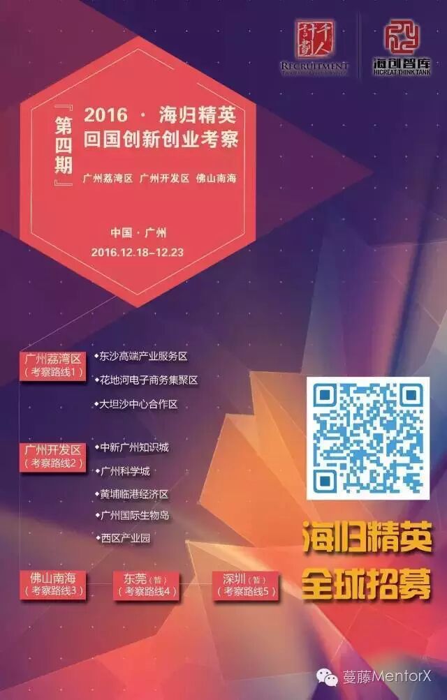所有报名成功并正式参加活动的海归人才将享受以下支持:成功对接的创业项目将获得地方政府和风投的资金和创业条件的支持;创新人才将获得地方大学、研究机构、企业或“千人计划”提供创新平台的支持;成功对接的创业项目将获得地方政府和风投的资金和创业条件的支持;意向报名考察团的海外人才,请参考千人计划各个项目申报标准,择优参加(千人计划项目申报标准,请点击【阅读原文】);3. 报名成功后,需要提供个人简历、学历证明文件和回国考察的目说明4. 有项目回国落地的,请提供项目商业计划书;有科研项目的,请提供科研项目计划。(商务计划书和科研项目,请以PowerPoint格式提供)以沿江国企地块改造为突破口,参考珠啤改造模式,重点突破珠江钢琴厂、广州侨光制药厂、广州柴油机厂等地块借助花地河沿岸资源,改造沿岸旧厂房,完善电子商务支撑服务体系,全力打造集电商、物流、智能制造为一体的服务体系。着力打造“新广合作”的示范性工程,与新加坡相应的机构、企业合作,共同打造具有新加坡特色的包含医疗器械、健康产品、研发检测、医药金融、养老等功能齐全的“健康产业城”。重点建设院士专家创新创业园、知识产权保护与服务园区、国家检验检测高技术服务业聚集区、教育枢纽、东方国际医学谷、智能装备产业园、腾飞科技园等15个专业园区。推动科学城现有创客空间、孵化器升级发展,加大高水平众创空间建设力度。加强对研发机构、创新创业人才等创新资源,以及科技金融、技术转移、知识产权等科技服务机构的集聚力度。推动鱼珠地段的码头搬迁改造,充分发挥广东外运、广州钢集团、广物集团、中远集团等航运总部的集聚效应,加快建设港航、商贸、物流等项目。重点推动中以生命科技园、中以生物产业孵化基地、国家“千人计划”生物医药创新创业示范园、中欧生命科技园等平台发展。支持区内精细化工、食品饮料等传统企业开展商业模式创新,引导企业搭建电子商务平台等方式延伸产业发展链条,实现升级转型发展。