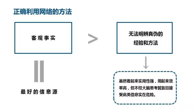 在我们利用网络搜集事实的时候,千万要注意将客观事实和不能明辨真伪的方法严格区分开。需要引起我们重视的是客观事实。客观事实是最好的信息源。