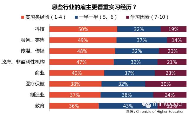 美国知名高校杂志Chronicle of Higher Education不久前针对美国企业雇主的调查结果也证实了这一认识。在让雇主们对一系列招聘因素的重要性进行排列时,“是否有过实习经历”成为企业在招聘应届毕业生时最重要的考量(见上图),而“大学GPA”、“修了什么样的课程”、“大学品牌”这些“学习”相关因素则被排在最末。当然这并不意味着学校和成绩不重要:学校的口碑和过关的成绩往往是学生申请到一流实习机会的基础。所以,一份高质量的实习也是对学校和成绩的认可。就具体专业(行业)而言,科技类、零售类、传媒类企业对毕业生的实习经验最为看重(见下图)。