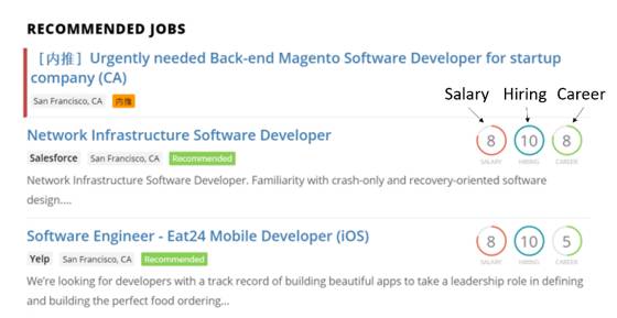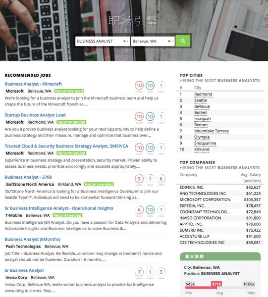 蔓藤教育精英导师独家提供的名企内推机会,只需一键上传简历,导师帮你连线企业recruiter。权威标准为各个工作打分,三大指数综合反映岗位细节:☆ 【Salary index】: 同一城市同类公司薪金待遇对比。这个指数越高,salary offer越高。要是有个公司是10(满分10分),那基本就是在你搜索的城市里待遇最好的了。☆ 【Hiring index】: 公司在过去为留学生提供工作的指数,相当于international student friendly index。指数越高,这个公司开放给留学生的工作岗位就越多。 ☆ 【Career index】: 搜索的岗位占该公司所有招聘岗位的比例。这个指数用处在哪?比如说,同样是IT工作,在医院工作和在IT公司的感觉可是大不一样的。Career index基本预示了你在公司的发展空间。如果career index很高,说明你在这个公司向上发展的空间还是很大的。我猜用过职场引擎的小伙伴们要问了,为什么打开职场引擎里的工作后跳转到了Indeed网站呢?那是因为你在职场引擎上所看到的工作是为大家在眼花缭乱的Job List中找到接受留学生的工作。Indeed的信息量无比之大,在它成千上万的公司列表中找到只招聘中国留学生的恐怕就如海底捞针了。而且,从Indeed客服了解到,Indeed网站在显示搜索结果时,他们还会根据每个公司在刊登招聘信息时花的钱来排列,也就是说把投钱最多的岗位放在搜索列表的最上面。由此可见,职场引擎真正做到让小伙伴投出的简历不再石沉大海,不要太感动哦 ^_^