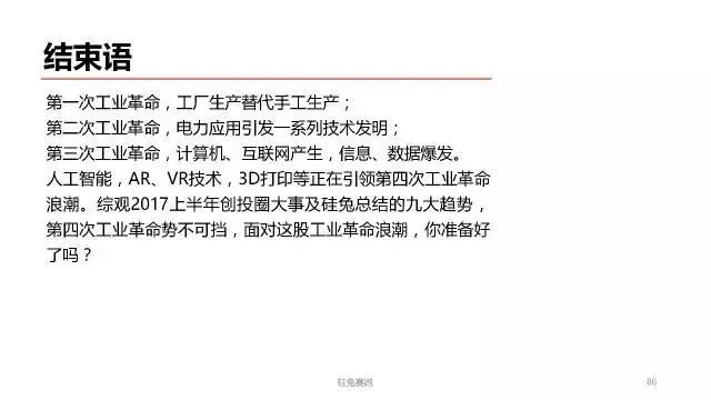 转自 硅兔赛跑 上半年, Alpha Go、Neuralink、Snapchat火了, Uber CEO 黄了; 亚马逊胜了,Costco负了; 我们不再谈论mobile,开始谈论人工智能; 第四次工业革命,就这么悄然无息地开始了...... 上半年, 硅兔赛跑与大家一起见证了很多大事(点击阅读): 亚马逊没出现就霸屏CES ; 陆奇强势回国 ; 全球首发YC 2017 项目路演全收录 ; 马斯克和90后创始人成立Neuralink ; ..... 我们发表了众多独家观点: 对科技圈来说,2017是新的2004 ; 90后该如何看待Snapchat上市 ; 00后原来是一帮这样的孩子 ; 我们可能是最后一届人类 ... 是时候对我们上半年一起走过的日子, 做一个完整的总结和复盘了。 下半年,硅兔赛跑希望可以更好地陪伴你。 《2017上半年创投圈终极复盘》献上, 正文如下。