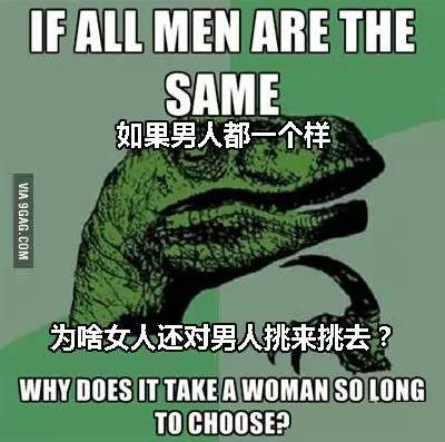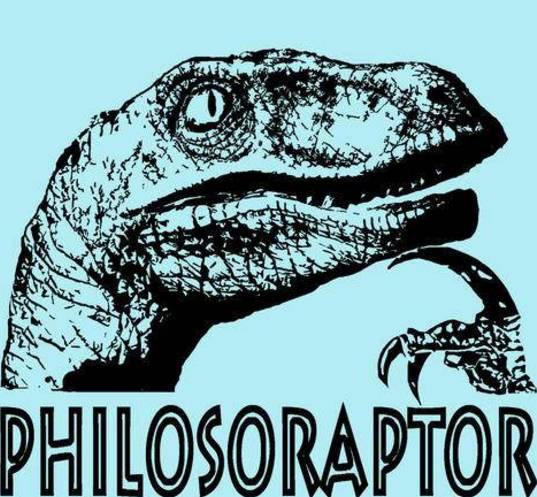 Philosoraptor是由 Philosopher(哲学家)和velociraptor(迅猛龙)两个单词合成而来的,Meme的图片就是一只迅猛龙托着下巴作思考状。人们常用这个Meme提出一些有思想性的疑问,当然绝大部分还是一些逗比的问题。