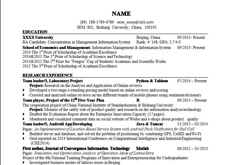 简历,按照先后顺序,一般包含开头,Education Information(教育信息),Internship(实习经历),Research Experience(科研经历),Extra-curriculum(课外经历),Skill(技能)六大板块。