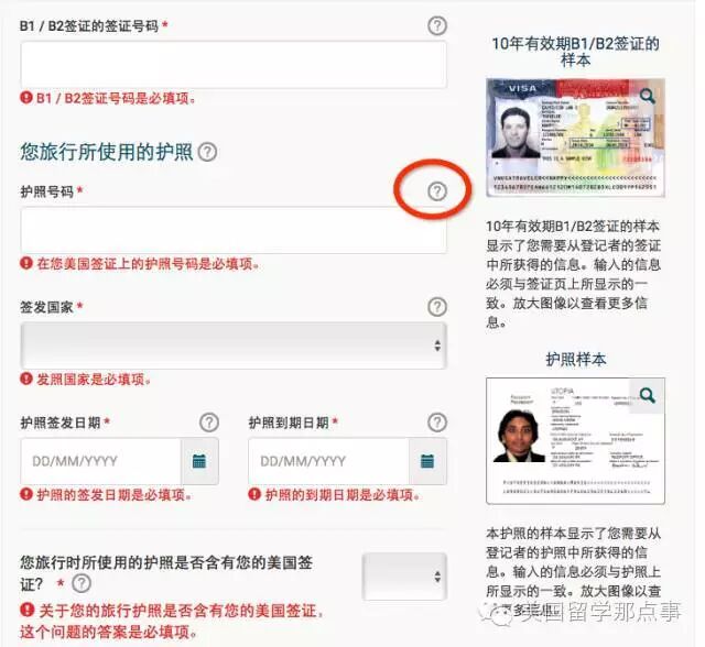 六、填写护照等信息时,找不到相应的信息位置,可以点击每个问题右上角的“?”,会有进一步的解释说明。例如;签证号码:即为签证页上的一串红色数字;护照号:在护照本扉页。