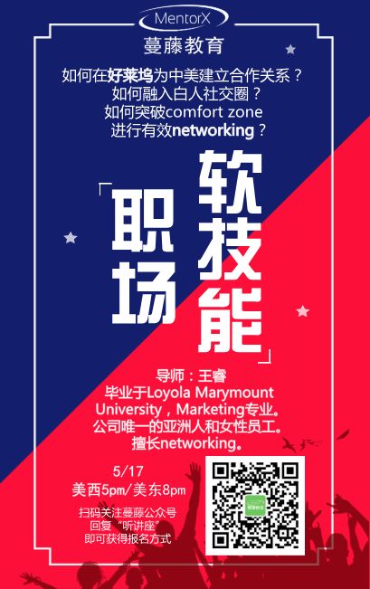 “您好,请问您的房子近期打算卖吗? 我们是xx地产…” “您好,这里是xx机构,请问你是否需要了解一下xx培训?” 在国内的时候, 小编就常常接到这样的推销电话 那时还年少无知的我 不知该如何拒绝他们 久而久之养成了不接陌生电话的习惯 终于来了美国, 一心想着这下总该没有骚扰电话了吧 结果还是too young too simple! 个人信息总是泄露的那么快 催着买卖房子的电话 即使飞了一万多公里还是找上门来了 当时我的内心就在想 万恶的资本主义 还是逃不过天杀的Marketing的套路 随着小编开始了解学习Marketing的时候 (此处应有pia~pia~打脸声) 才恍然发现自己 还是书读得太少 居然分不清Marketing和Sales!!! 什么是Marketing? Marketing is the science and art of exploring, creating, and delivering value to satisfy the needs of a target market at a profit. 营销就是通过探索,创造和传递产品及价值,从而满足需求的过程。 -- 现代营销学之父Philip Kotler 简单来说市场营销就是通过发现需求、做好产品、树立品牌、建立渠道、满足客户使得公司的产品更加好卖。 具体来讲,市场营销主要的活动是: 大道理人人会讲,这样泛泛而谈的定义更是随手google一下就有,可是你知道吗?在职场里,每个人都需要为自己打造品牌,才可以最快让他人记住,在人群中脱颖而出! Marketing与职场存在着怎样的联系?如何才能提高自己的竞争力? 是时候比拼一波软实力了!!! 什么是职场软技能? 小编认为职场软技能包括:自我认识,情绪管理,团队合作,谈判技巧,沟通能力,管理能力,领导能力等。这些能力没有可以量化的标准,不会体现在你的工作绩效里,但却会帮助你在职场上受到更多青睐。 回到文章的开头,其实,如何让顾客愿意接听推销电话也是一种软技能的表现哦~ 那么,在学校和职场中需要具备怎样的职场软技能?在大学或者研究生期间该怎么做,如何通过有效的Networking把自己培养成一位优秀的Marketer? 最最重要的是,中国留学生如何才能突破自己的Confort Zone,融入美国主流社交圈?如何靠着自己的能力拿到心仪的Job Offer? 百问不如一见 听听资深Marketer大牛怎么说 王睿导师 - 毕业于Loyola Marymount University,Marketing专业。 - 毕业后凭借自己的努力,成为公司唯一的亚洲人和女性员工。 - 导师在第一份工作中很快融入了美国主流社会圈,与公司老板建立了深厚的友谊。 - 毕业后的工作边学边做,从中建立的自信,完美地跨到全新的行业。 - 现在在SoCal Capital公司任Managing Director一职,负责中资基金做房地产投资开发。 本次讲座中,导师将根据自己的经历为同学们详细介绍如何在在校期间提前做规划,来提高自己的竞争力;如何增强职场软技能;如何避免求职误区;以及毕业之后如何真正融入美国市场,成为一名优秀的Marketer。 讲座须知 讲座时间: 5月17日 周四 美西时间 5 - 6 pm 美东时间 8 - 9 pm (时间冲突的同学可以随时回放讲座内容) 讲座方式:千聊 报名方式 关注MentorX公众号 回复“听讲座” 获得讲座参与方式 本文为蔓藤教育原创文章,未经授权请勿转载 如需转载请在后台留言 排版:Jessie