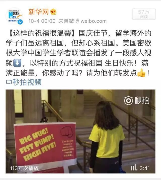 根据我们学校的惯例,一般是大四学生或者研究生才会当主席,而参与竞选时我还是小一届的学弟。考虑到只有更高的位置才能有更多的话语权和权力,有了话语权,我的一些构思和想法才能更好地贯彻下去。不是说想去领导任何人,而是为了可以更好地服务当地的华人与留学生,这也是我加入学生会和竞选主席的一个不变的初衷。学生会的一大传统就是每一年都推举出2个主席。但一般情况下,两位主席是从不同的部门中选举出来,因此负责的事务各不相同,分工也有侧重。分工合作大大减轻了压力,也促进了内部的团结和合作。在这样的团队合作中,学生会干事之间产生了深厚的默契,几乎没有出现对立争执的情况。在去年和今年的国庆节,身为联合主席的路瀚程在密歇根大学,遥远的美国的土地上组织过多次花式庆祝祖国生日的活动。在2015年,密歇根大学中国学联组织了国庆广播体操快闪的活动,在学校的中心广场上以特殊的方式庆祝国庆节,并以新奇的方式向美国当地学生展示新一代中国留学生的创意和活力。今年国庆节,路瀚程组织密大中国学联录制了一段3分钟多的祝福视频,在视频中许多中国留学生在校园的各处与当地美国学生free hug、击掌,分享自己祖国生日的喜悦,用特殊的方式传播中国的影响力和中国可爱的一面,视频在微博和微信上一时间小火起来,环球时报,新华网,共青团中央,北美留学生日报同时转载视频,总播放量达到113万。在这之前,作为活动部干事也做出了一些比较好的成绩。学校每年都会举办春晚,而去年,我们把安娜堡最豪华的一个剧院——密歇根剧院租了下来,当作春晚的会场。作为校外举行的首发,条件和规模都比以往要好很多,当天吸引了1200位观众的出席,最终出来的效果也非常令人满意。