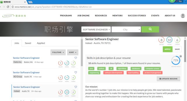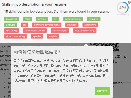 又是一年的毕业季! 有人说,毕业季也是离别季…… 曾经的同窗,如今各奔东西。 迫于升学的紧迫, 迫于初出象牙塔的现实压力, 我们焦虑, 我们迷茫, 我们也彷徨…… 作为毕业生的你, 是否已经拿到了心仪学校的offer? 还是已经进入了梦寐以求的公司开始了真正的“大人”的生活? 是还在迷茫不知如何开始寻找工作机会, 还是手握EAD Card 却迟迟等不来工作offer? 又或者因为只有一年的OPT而始终无法找到身在异乡的“归属感”…… 无论你现在身处何方, 无论你是哪种境况, 今天小编就把私藏的找工作小秘密分享给你们~ 机密 总说找工作找工作, 那我应该去哪儿找呢? 作为应届毕业生,小编也跑过很多大大小小形形色色的Career Fair和校内的Info Session, 俗称校招。 可是social了一轮又一轮, elevator pitch 说了几十遍…… 然并卵…… 一百多家公司,也许只有十几家愿意招国际生。十几家里面有可能仅有几家愿意sponsor。 曾经以为前途是光明的, 要毕业了才发现,原来道路真真是曲折的。 困难那么多, 难道就不找了吗?? 留学生群体那么庞大, 难道就没有我们的容身之地用武之地吗? 作为LinkedIn的狂热粉, 小编之前刷LinkedIn的招聘信息简直比刷朋友圈都要勤快了。 可是简历也投了, 电话也聊了, 有的甚至面试了都两轮了…… 一提到sponsor,就we are sorry了…… 又或者, 可能第一轮简历筛选就拜拜了…… 积极一点地想, 我锻炼了自己,积累了经验。 可内心os就是—— “这不是瞎耽误功夫嘛”! 真想要一个“小秘“!!! 请她帮我筛选一遍招聘信息 也能帮我匹配简历, 助我找出缺失的信息和关键技能。 贴心的蔓藤团队仿佛会读心术! 这不,Job Engine 职业引擎 3.0 版就是我们大家的“小秘书”啦。 Job Engine 职业引擎是为留学生量身定做的招聘信息搜索引擎。 集合全网的招聘信息, 经过大数据筛选和比对, 融合了人工智能和机器学习的先进技术, 成为我们找工作的“小秘书”。 目前最大的招聘信息搜索库indeed 小编也使用过, 信息固然丰富,但是也“杂”。 大海捞针可要捞好一会儿呢。 而Job Engine 职业引擎最吸引小编的两大特点—— 大概就是筛选和匹配分析的功能了。 通过键入关键字或者job title, 系统会从全网抓取信息, 经过筛选招聘信息, 分析得出每则信息的职业发展前景、过去招聘国际生的情况以及同行业薪资优势等进行评分。 通过比对简历, 匹配job description 得出匹配程度和软硬技能方面的重合以及欠缺。 听不懂? 那就看图说话吧: 比如一份cs专业的同学的简历上传搜索后如上图所示。 左侧: 红色代表起薪在同行业同领域工作中的优势。 蓝色代表公司往年sponsor 工作签证的情况和数量。 绿色代表本职位的发展前景。 选中每则信息后, 右侧的分析结果会告诉我们上传的简历与工作要求的匹配程度。 技能方面,比对过招聘信息后:标出绿色的技能是简历里面有的,红色的是简历里面欠缺的。 不知道你是不是也听说过, 许多big company第一轮筛简历就是这种类似的关键词搜索。 知道你为什么第一轮就拜拜了么? 很可能是关键词不够精确和全面造成了系统筛选过后的不匹配。 机密 想要成为那个matched candidate嘛? 再教你一招! 投简历以前, 可以根据系统的提示以及重新研读招聘信息, 根据招聘要求, 再重新修改补充简历。 要知道,很多技能和经历你本来是具备的, 可能只是不会表达而已。 小编不禁再次感叹“科技造福人类啊” 但是,俗话说得好, ”师傅领进门,修行靠个人“! 如果还不放心或者有任何的问题, 扫描下方的二维码, 即可接入贴心的人工客服小姐姐为你介绍详情哦 还可以领取价值300刀的求职大礼包 小蔓 添加了解更多项目详情 帮大家拿Offer的小蔓 工作怎么找的小秘密小编已经分享给你们了。 至于简历怎么改,Cover Letter 怎么写? 又或者面试里如何表现自己? 内推机会怎么要? 欠缺的知识技能如何亡羊补牢? 这些问题,请关注我们的微信公众平台或者添加小蔓和小锥的微信解惑哦! 如需转载请在后台留言 排版:Ada