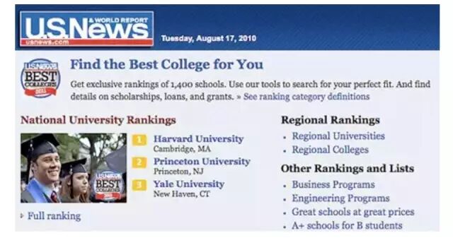 该体系也包含了很多方面。它并不只是从单方面比较——如新生的考试成绩,或是学术声誉。它固定地用一种算法对每所院校进行统计,并给出一个得分:照此而言,宾夕法尼亚州立大学和维拉诺瓦大学得分相同。USNews排名如此受欢迎,原因很简单:它可以用一个分数就评判出不同的院校,如维拉诺瓦大学和宾夕法尼亚州立大学,不然院校间很难进行比较。